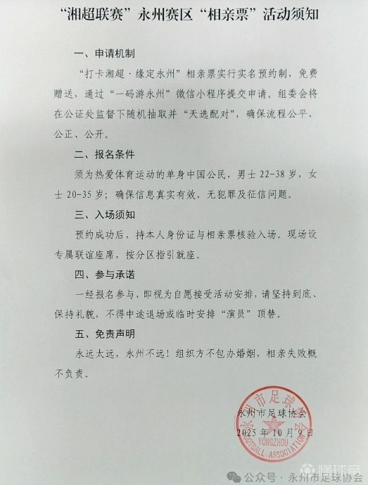 九派新闻观察到,永州市足球协会发布的“湘超联赛”永州赛区“相亲票”活动指南显示——相亲票采用实名预约制度,免费发放,参与者需通过“一码游永州”微信小程序提交申请。组委会将在公证处的监督下进行随机抽取,并实施“天选配对”机制,以确保整个流程的公平性、公正性和公开性。活动指南还明确指出,一旦报名参与,即视为自愿接受活动安排,参与者需全程参与,保持礼貌,不得中途退场或临时安排他人顶替。
