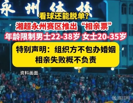10月9日,永州市足球协会在即将举行的“湘超联赛”第5轮永州队对阵邵阳队的赛事中,推出了“相亲票”服务。九派新闻报道,据永州市文化旅游广电体育局工作人员透露:“‘相亲票’的报名人数相当可观,且我们已针对相亲对象的赛场座椅进行了特别设计。”相关新闻链接:【湘超永州队主场推出“相亲票”:男性22-38岁,女性20-35岁】